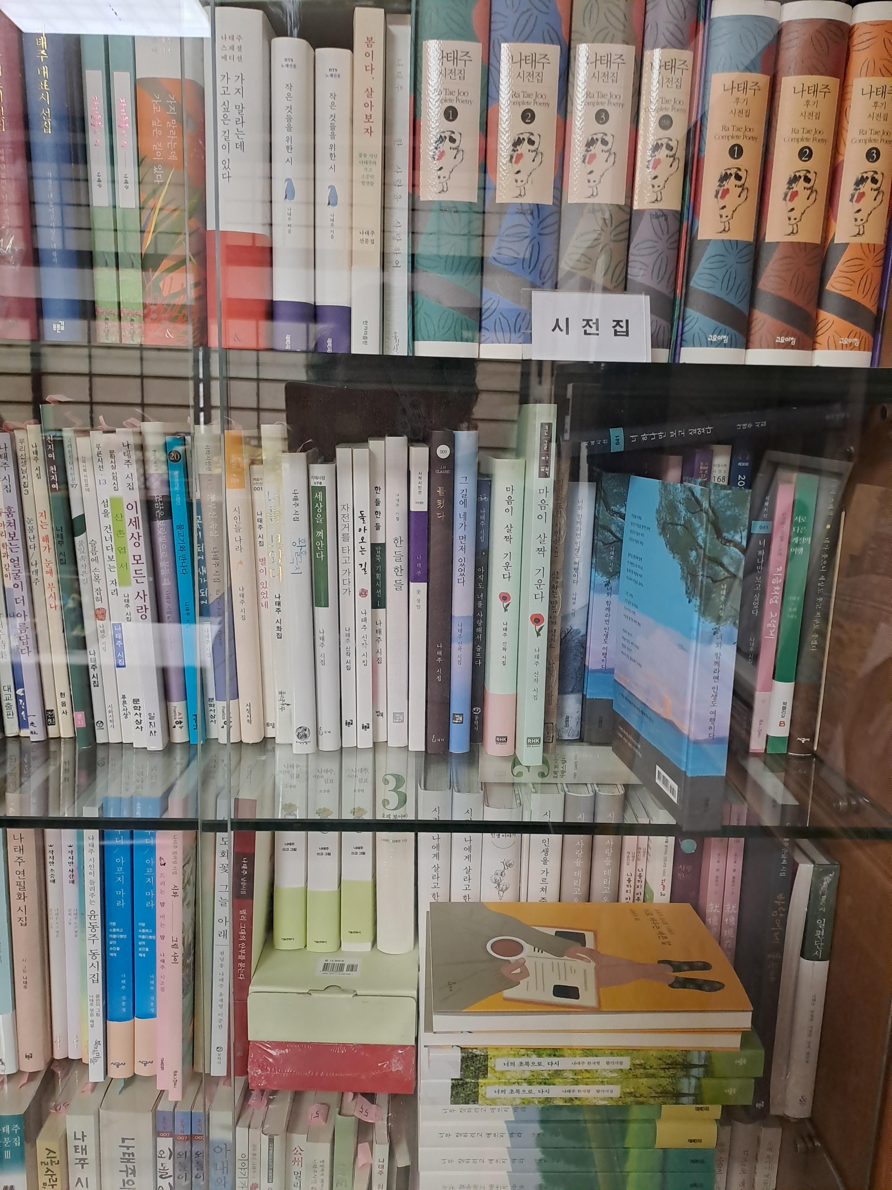시인의 상패,시집,산문집이 책장에 꽂혀 있다.