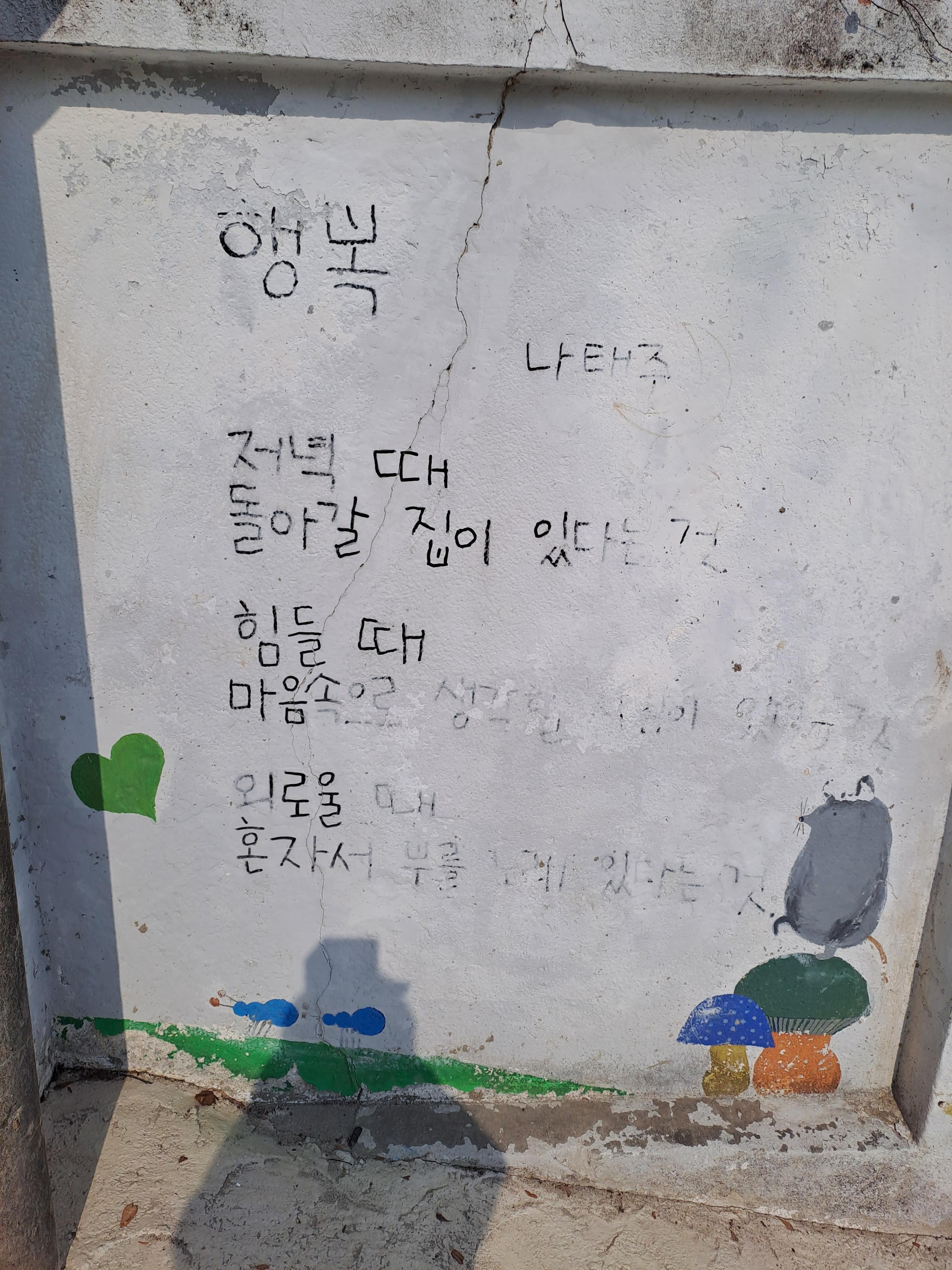 담벼락에는 낙서처럼 시가 적혀있고 그림도 그려져 있다.
