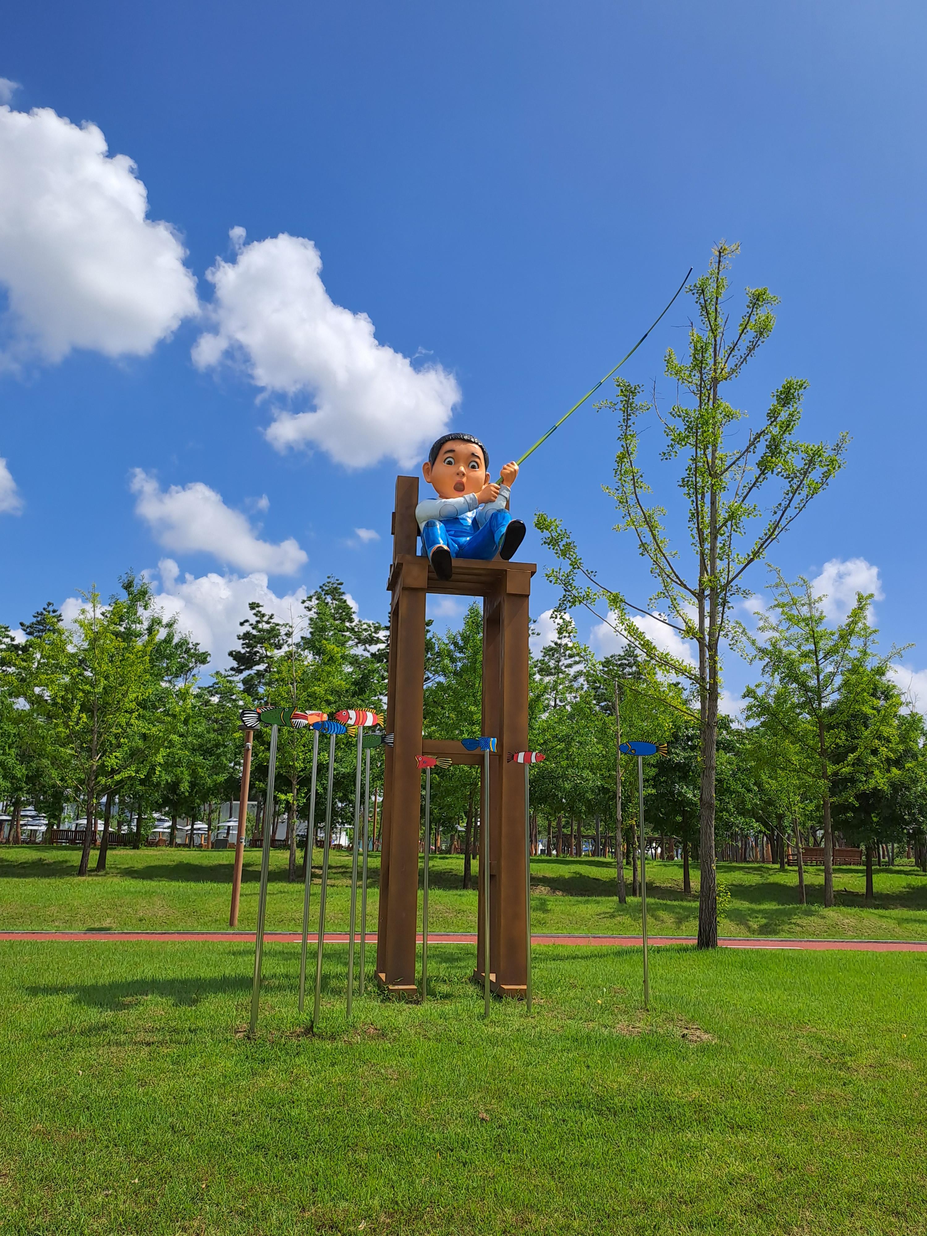 어린이가 긴 의자에서 물고기가 걸린듯 낚아채며 놀라는 장면을 조각 작품으로 형상화했다.