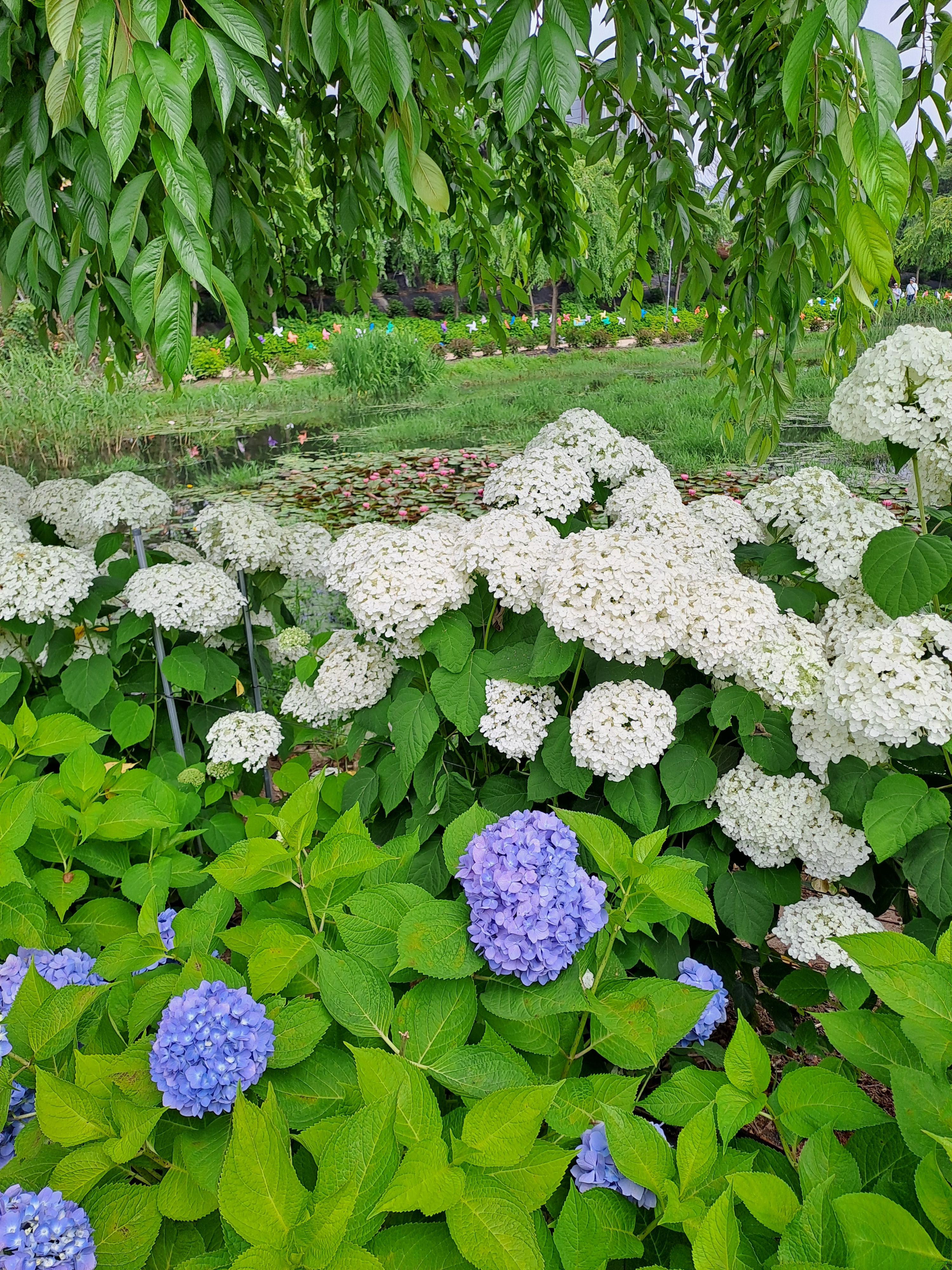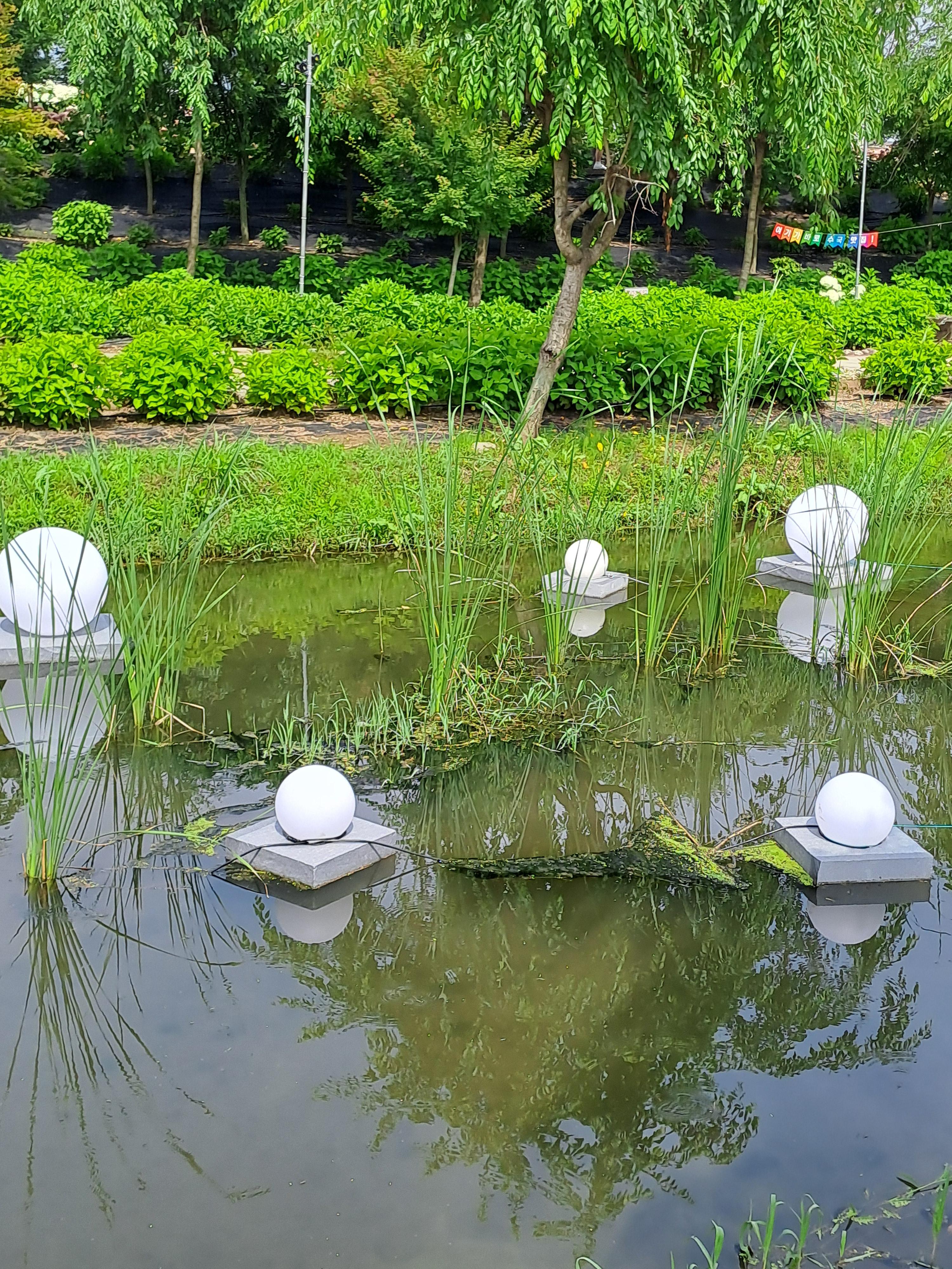 길 양쪽에는 수많은 수국이 피어 있고 길 옆 하천에는 배를 띄워놓고 징검다리도 만들어 놓았다.